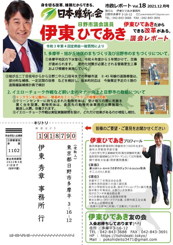 2022年1月7日 / 最終更新日 : 2022年4月21日 htp_sugawara チラシ・フライヤー 伊東ひであき様 日本維新の会 日野市議会議員、伊東ひであき様 市政レポートを制作しました。 今回ははがき付きのチラシになります。