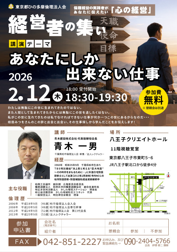 ひの多摩倫法人会様主催の経営者の集いのチラシを作成しました。